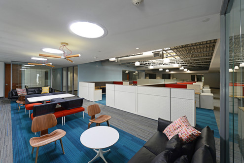 El nuevo diseño buscó abrir el espacio abierto y aumentar la entrada de luz natural al edificio. Se eliminaron paredes interiores y se instalaron estaciones de trabajo de baja altura, creando un espacio central tipo “loft”. Las oficinas privadas se ubicaron en la periferia con muros de cristal y nuevas ventanas para más luz natural. La recepción se renovó con una piel de cristal, tragaluces y un portal de entrada de hormigón expuesto.